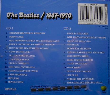 Made In Italy. Booklet: CD1 All tracks digitally re-mastered at Abbey Road Studios Tracks 1-5, & 7-11 ℗1987, track 6 & 12-14 ℗1988 The copyright in these sound recordings is owned by EMI Records Ltd. ℗1993 The copyright in this compilation is owned by EMI Records Ltd. ©1993 Apple Corps Ltd. under exclusive licence to EMI Records Ltd. CD2 All tracks digitally re-mastered at Abbey Road Studios Tracks 1-3, 8-11, 13 & 14 ℗1987, tracks 4-7 & 12 ℗1988 The copyright in these sound recordings is owned by EMI Records Ltd. ℗1993 The copyright in this compilation is owned by EMI Records Ltd. ©1993 Apple Corps Ltd. under exclusive licence to EMI Records Ltd. Artwork conversion and adaptation P.Linard Marketing and Advertising Ltd. Additional cat# for UK is CDPCSP 718. Track 2-01 also spelt as "Back In The U.S.S.R." in booklet. Theres is also an other Version, repackaged and advertised as a limited edition Contains: Double CD, HMV-Beatles Button, Poster, 12 page full color booklet, and 2 japanese inserts CD is printed in Holland