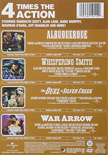 Details: The 4 Movie Marathon: Classic Western Collection includes Albuquerque, Whispering Smith, The Duel at Silver Creek and War Arrow. Starring Randolph Scott, Alan Ladd, Audie Murphy, Maureen O'Hara, Jeff Chandler and More!