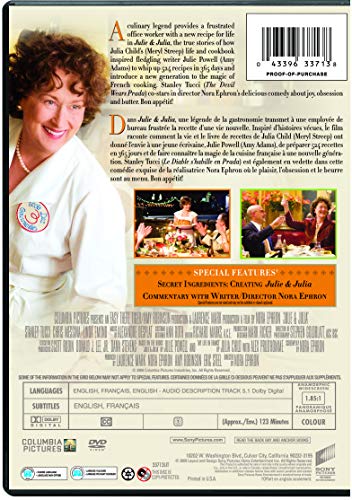Details: Product Description A culinary legend provides a frustrated office worker with a new recipe for life in Julie & Julia, the true stories of how Julia Child's (Meryl Streep) life and cookbook inspired fledgling writer Julie Powell (Amy Adams) to whip up 524 recipes in 365 days and introduce a new generation to the magic of French cooking. Stanley Tucci (The Devil Wears Prada) co-stars in director Nora Ephron's delicious comedy about joy, obsession and butter. Enjoy your food! Amazon.ca Julie & Julia is a film that should be relished with gusto--accompanied by the freshest and best ingredients, pounds of butter, and bottles of the very best wine. It lovingly celebrates the life of one of American food's most influential and beloved figureheads: Julia Child--played here with zest, humor, and a sweet, subtle respect by Meryl Streep, whose performance is spectacular. Julie & Julia is based on the book by Julie Powell, a frustrated New York bureaucrat who wants to be a writer. "But you're not a writer until someone publishes you," she moans. So she gives herself a challenge: to cook her way through Julia Child's Mastering the Art of French Cooking in one year, and to blog about it. As Powell (played with chirpy determination by Amy Adams), begins to find her groove as a cook, and her voice as a writer, the project takes on a life of its own--and in the end it does provide the struggling young woman with her life's purpose, to her very pleasant surprise. But mostly, Julie & Julia is a valentine to Child, to Child's amazing love affair with her dashing husband, Paul (Stanley Tucci, as divine as any soufflé in the film), and to her outlook on embracing life, and ordering seconds. Streep throws herself into the Child role with real affection for her character, and while certain of Child's idiosyncrasies--including her warbly voice and unflappable haphazardness in the kitchen--are retained, it's Child's character and vision which form Streep's portrayal, and which make the film so involving and rewarding. Nora Ephron directs with deftness and a light touch, though she seems at times to be encouraging some of Meg Ryan's onscreen tics in Adams (the self-conscious head tilt, for one). But mostly she simply allows Streep to channel Child and her love of food, her husband, and 1950s Paris. And that is a recipe for something truly sublime. --AT Hurley