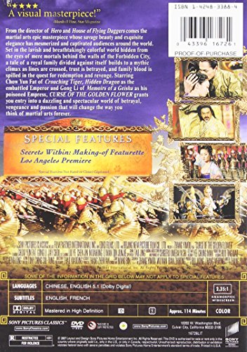 Details: From the director of Hero and House of Flying Daggers comes the martial arts epic masterpiece whose savage beauty and exquisite elegance has mesmerized and captivated audiences around the world. Set in the lavish and breathtakingly colorful world hidden from the eyes of mere mortals behind the walls of the Forbidden City, a tale of a royal family divided against itself builds to a mythic climax as lines are crossed, trust is betrayed, and family blood is spilled in the quest for redemption and revenge. Starring Chow Yun Fat of Crouching Tiger, Hidden Dragon as the embattled Emperor and Gong Li of Memoirs of a Geisha as his poisoned Empress, Curse of the Golden Flower grants you entry into a dazzling and spectacular world of betrayal, vengeance and passion that will change the way you think of martial arts forever.