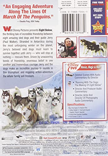 Details: Walt Disney Pictures presents EIGHT BELOW, the thrilling tale of incredible friendship between eight amazing sled dogs and their guide Jerry (Paul Walker). Stranded in Antarctica during the most unforgiving winter on the planet, Jerry's beloved sled dogs must learn to survive together until Jerry -- who will stop at nothing -- rescues them. Driven by unwavering bonds of friendship, enormous belief in one another, and tremendous courage, Jerry and the dogs make an incredible journey to reunite in this triumphant and inspiring action-adventure the whole family will treasure.