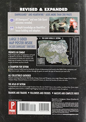 Details: • Add to your Skyrim collection – This 864 page guide is a fully revised version of the Official Game Guide for The Elder Scrolls V: Skyrim®, plus the robust Dawnguard™ and Hearthfire™ add-on content. • All Dawnguard™ and new Side Quest outcomes revealed. • In-depth knowledge on Hearthfire™ house building and adoption. • Exploration and discovery – New game add-on content is completely explored and detailed so you get the best experience possible. • Improve your character – Find out where all the new quests, best weapons, spells, and skill books can be found with updated maps. • 100% Developer approved - The same reliable production team pours their heart and soul into the next chapter of The Elder Scrolls V: Skyrim®. Covers: Xbox 360®, Playstation®3, PC