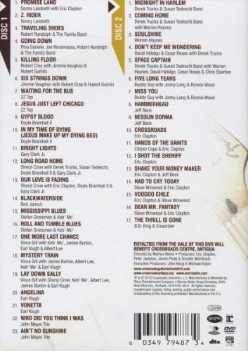 Details: Rhino Entertainment captured every epic note from that blistering summer day in Chicago - releasing over four hours in High Definition on Crossroads Guitar Festival 2010. Fans around the world will have a chance to experience many of the festival's greatest moments including performances by Clapton, ZZ Top, Steve Winwood, BB King, Jeff Beck, Vince Gill, Sheryl Crow, Buddy Guy, John Mayer, Bill Murray and many, many others as well as behind-the-scenes footage and candid interviews with the performers. DVD 1 Promise Land - Sonny Landreth with Eric Clapton Z. Rider - Sonny Landreth with Eric Clapton Traveling Shoes - Robert Randolph & The Family Band Going Down - Pino Daniele, Joe Bonamassa, Robert Randolph & The Family Band Killing Floor - Robert Cray with Jimmie Vaughan & Hubert Sumlin Waiting For The Bus - ZZ Top Jesus Just Left Chicago - ZZ Top Gypsy Blood - Doyle Bramhall II In My Time Of Dying - (Jesus Make Up My Dying Bed) - Doyle Bramhall II Bright Lights - Gary Clark Jr. Long Road Home - Sheryl Crow with Derek Trucks, Susan Tedeschi, Doyle Bramhall II & Gary Clark Jr. Our Love Is Fading - Sheryl Crow with Eric Clapton, Doyle Bramhall II & Gary Clark Jr. Blackwaterside - Bert Jansch Mississippi Blues - Stefan Grossman & Keb Mo Roll And Tumble Blues - Stefan Grossman & Keb Mo One More Last Chance - Vince Gill with Keb Mo, James Burton, Earl Klugh & Albert Lee Mystery Train - Vince Gill with James Burton, Albert Lee, Keb Mo & Earl Klugh Lay Down Sally - Vince Gill with Sheryl Crow, Keb Mo, Albert Lee, James Burton & Earl Klugh Angelina - Earl Klugh Vonetta - Earl Klugh Who Did You Think I Was - John Mayer Trio Ain't No Sunshine - John Mayer Trio DVD 2 Midnight In Harlem - Derek Trucks & Susan Tedeschi Band Coming Home - Derek Trucks & Susan Tedeschi Band with Warren Haynes Soulshine - Warren Haynes Don't Keep Me Wondering - David Hidalgo & Cesar Rosas with Derek Trucks Space Captain - Derek Trucks & Susan Tedeschi Band with Warren Haynes , David Hidalgo, Cesar Rosas & Chris Stainton Five Long Years - Buddy Guy with Jonny Lang & Ronnie Wood Miss You - Buddy Guy with Jonny Lang & Ronnie Wood Hammerhead - Jeff Beck Nessun Dorma - Jeff Beck Crossroads Hands Of The Saints - Citizen Cope & Eric Clapton I Shot The Sheriff Shake Your Money Maker - Eric Clapton & Jeff Beck Had To Cry Today - Steve Winwood & Eric Clapton Voodoo Chile - Eric Clapton & Steve Winwood Dear Mr. Fantasy - Steve Winwood & Eric Clapton The Thrill Is Gone - BB King & Set