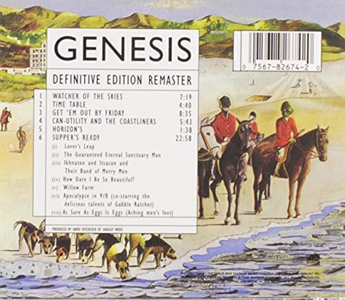 Details: Amazon.ca Foxtrot marked a decisive point in Genesis's career. An emerging art-rock band who were building up a growing cult following with a busy touring schedule, this album was an artistic and commercial landmark: It was their first album to chart, reaching Number 12 (rather bizarrely, it made it to Number One in Italy!). Including the classic "Watcher Of The Skies" and Peter Gabriel's whimsically compassionate slice-of-life "Get 'Em Out By Friday", the highlight was the ambitious side-long epic "Supper's Ready". Comprising seven linked subsections, it is a story of two lovers and the struggle between good and evil; certainly it was the most innovative and entertaining piece the band had produced to date. Depending on your perspective, the relatively low production values of the recording could be said to detract somewhat from the impact of the album or to add a pleasantly rough edge to what might otherwise be a somewhat prim sound. --James Swift Product description 1972 album which was to become an artistic and commercial landmark. Feat. Peter Gabriel on vocal duties.