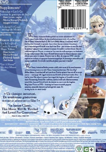 Details: Product Description Winner of the 86th Annual Academy Awards® for Best Animated Feature Film and Best Music (Original Song) Featuring the voices of Kristen Bell and Idina Menzel, "Frozen" is the coolest comedy-adventure ever to hit the big screen. When a prophecy traps a kingdom in eternal winter, Anna, a fearless optimist, teams up with extreme mountain man Kristoff and his sidekick reindeer Sven on an epic journey to find Anna's sister Elsa, the Snow Queen, and put an end to her icy spell . Encountering mystical trolls, a funny snowman named Olaf, Everest-like extremes and magic at every turn, Anna and Kristoff battle the elements in a race to save the kingdom from destruction. -------------- Elsa has magical powers that allow her to create objects out of ice and snow and freeze things around her. The day she hurts her sister Anna while having fun with her, her parents ask her to contain her emotions and not reveal her powers to anyone. When they die, Elsa becomes the heir to the throne. On the day of her coronation, news from her sister overwhelms her and she unwittingly reveals her magic to the faithful. Treated as a witch, the new queen flees into the mountains. Anna then goes looking for her to try to convince her to return to the kingdom. Amazon.ca A sweet, magical film filled with great music, likable characters, and striking effects, Frozen is a fairy tale about overcoming obstacles and the power of true love. Princesses Anna and Elsa are sisters and the closest friends until one day Elsa discovers that she can no longer control her power to create ice and snow. Terrified for the safety of her sister and everyone around her, Elsa isolates herself and vows to never feel any sort of passionate emotion again in hopes of suppressing her powers. But when Elsa comes of age and is set to be crowned queen, she must open the gates of the palace and let in the public, not to mention her sister Anna. Things go horribly wrong and Anna pursues her sister into the mountains in an attempt to save Elsa and reverse the deep freeze that Elsa has inadvertently released on the kingdom of Arendelle. Along the way, Anna joins forces with Kristoff (Jonathan Groff), an ice seller with a strangely close relationship with his reindeer Sven, and Olaf (Josh Gad), a goofy snowman whom she suddenly remembers from early childhood. In the end, Anna and Elsa discover that only by embracing their deepest feelings do they have a chance of saving themselves and the kingdom. Inspired by "The Snow Queen" story by Hans Christian Andersen, the film has plenty of quirky, lovable characters along with a nice blend of corny humor, serious sentiment, suspense, and peril. Kristen Bell and Idina Menzel deliver rousing performances of great music that includes original songs by Kristen Anderson-Lopez and Robert Lopez and an original score by Christophe Beck, and the visual effects are simply stunning. Frozen definitely succeeds in captivating audiences young, old, and every age in between. --Tami Horiuchi