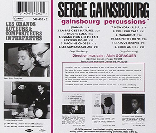Details: Amazon.ca In 1964, Serge Gainsbourg still frequented cabarets on the Left Bank, where he enchanted a limited audience with his classy refrains. But, after an almost Confidential album, recorded with double bass and guitar, he decided to beat his jazz while it was hot and to marry it with more exotic rhythms. He therefore offers himself 5 percussionists and 12 choristers, and leaves the company of "La Javanaise" to frequent the beautiful "Joanna" or the "Poor Lola". No more existential complaints, Gainsbourg celebrates love without philosophizing ("Couleur café"), admires the height of the buildings of "New York-USA" and frolics with "Les Sambassadors", close cousins of the "Girl From Ipanema". When sometimes his melancholy resists the Brazilian tunes, the African beats and the magic saxophone of Michel Portal, he rediscovers his skimpy costume of a decadent dandy and his suicidal impulses ("Quand mon 6.35 makes me look sweet"). But even if "Better to cry at nothing than to laugh at everything" ("Ces petits riens"), the twelve titles of Percussions turn out to be as playful as "Tattooed Jérémie". --Sabrina Silamo Product Description The first concept album of 1964. Serge here finds himself adapting his songs to Africa percussions 20 years before anyone else. Includes 'Poor Lola', 'New York-USA', 'Couleur Cafe' & more. Includes original artwork and extensive liner notes. 24 bit remastered. 2001 release. Standard jewel case.