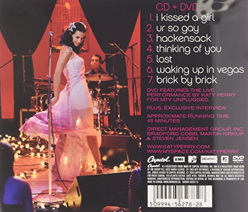 Details: Deluxe CD/DVD pressing of this 2009 release containing stripped down versions of her hits with the addition of strings and brass on select tracks. Katy Perry goes back to her acoustic singer/songwriter roots on MTV's legendary Unplugged series. See (and hear) the multi-platinum Pop/Rock superstar as you've never seen her before, performing her #1 hit singles 'I Kissed A Girl' and 'Waking Up In Vegas' plus 'Thinking Of You', 'Ur So Gay' and 'Lost'. Also includes two additional tracks: a cover of Fountains Of Wayne's 'Hackensack' and the never before released track 'Brick By Brick'.
