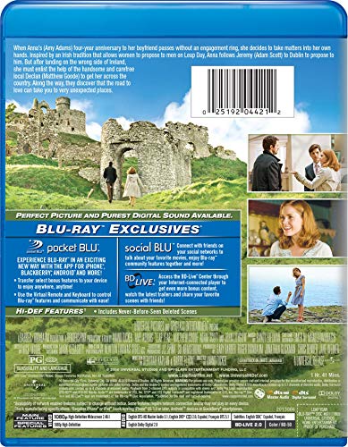 Details: Product Description When Anna's (Amy Adams) four-year anniversary to her boyfriend passes without an engagement ring, she decides to take matters into her own hands. Inspired by an Irish tradition that allows women to propose to men on Leap Day, Anna follows Jeremy (Adam Scott) to Dublin to propose to him. But after landing on the wrong side of Ireland, she must enlist the help of the handsome and carefree local Declan (Matthew Goode) to get her across the country. Along the way, they discover that the road to love can take you to very unexpected places. Special Features Deleted Scenes My Scenes BD-Live pocket BLU App