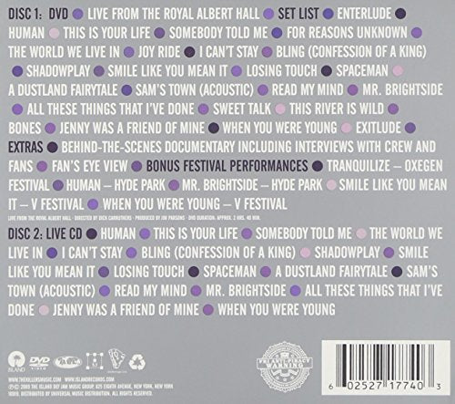 Details: Limited two disc (DVD + CD) edition of the very first Killers live DVD includes a bonus CD containing 17 of the show's performances. Live from the Royal Albert Hall features the Las Vegas band performing tracks from their three studio albums (2004 's Hot Fuss, 2006 's Sam's Town and 2008 's Day & Age) including the hit singles 'Human', 'When You Were Young', 'Mr. Brightside' and 'All These Things That I've Done' as well as rarer tracks including their cover of Joy Division's 'Shadowplay' and fan favorite 'Sweet Talk'. This package also includes the band's first and only live CD with 80 minutes of live performances. Special features on the DVD include behind the scenes documentary, alternative angles, bonus festival performances and more.