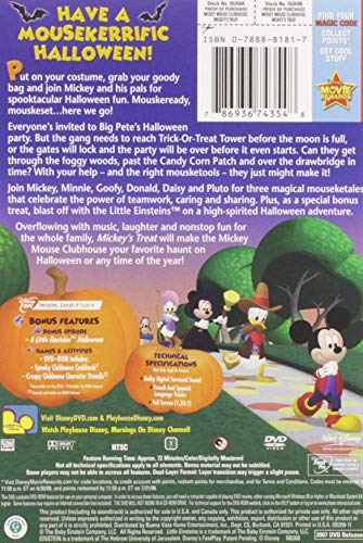 Details: Product Description Put on your costume, grab your goody bag and join Mickey and his pals for spooktacular Halloween fun. Mouskeready, mouskeset...here we go! Everyone's invited to Big Pete's Halloween party. But the gang needs to reach Trick-Or-Treat Tower before the moon is full, or the gates will lock and the party will be over before it even starts. Can they get through the foggy woods, past the Candy Corn Patch and over the drawbridge in time? With your help -- and the right mousketools - they might make it! Join Mickey, Minnie, Goofy, Donald, Daisy and Pluto for three magical mouseketales that celebrate the power of teamwork, caring and sharing. Plus, as a special bonus treat, blast off with the Little Einsteins(TM) on a high-spirited Halloween adventure. Overflowing with music, laughter and nonstop fun for the whole family, MICKEY'S TREAT will make the Mickey Mouse Clubhouse your favorite haunt on Halloween or any time of the year! Special Features Bonus Episode: "A Little Einsteins(TM) Halloween"|DVD-ROM Halloween Party Planning Activities: "Spooky Clubhouse Cookbook" and "Creepy Clubhouse Character Stencils"