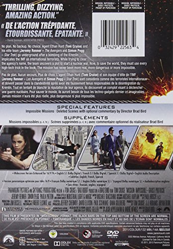 Details: No plan. No backup. No choice. Agent Ethan Hunt (Tom Cruise) and his elite team (Jeremy Renner and Simon Pegg) go underground after a bombing of the Kremlin implicates the IMF as international terrorists. While trying to clear the agency's name, the team uncovers a plot to start a nuclear war. Now, to save the world, they must use every high-tech trick in the book. The mission has never been more real, more dangerous, or more impossible.