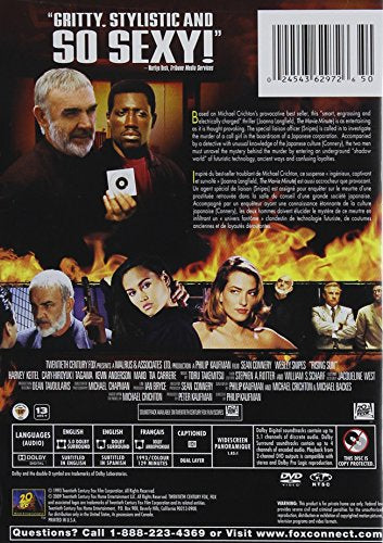 Details: A Los Angeles special liaison officer (Wesley Snipes) is called in to investigate the murder of a call-girl in the boardroom of a Japanese corporation. Accompanied by a detective with unusual knowledge of the Japanese culture (Sean Connery), the two men must unravel the mystery behind the murder by entering an underground "shadow world" of futuristic technology, ancient ways and confusing loyalties.