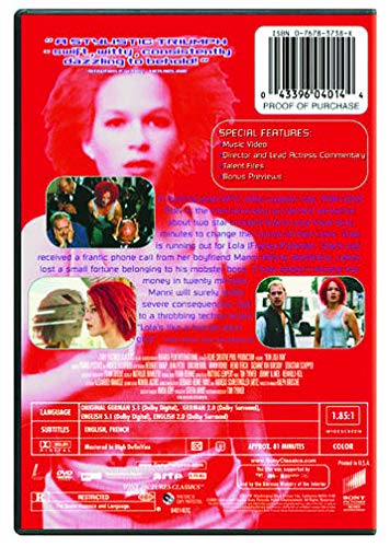 Details: A thrilling post-MTV, roller-coaster ride, RUN LOLA RUN is the internationally acclaimed sensation about two star-crossed lovers who have only minutes to change the course of their lives. Time is running out for Lola (Franka Potente). She's just received a frantic phone call from her boyfriend, Manni (Moritz Bleibtreu), who's lost a small fortune belonging to his mobster boss. If Lola doesn't replace the money in twenty minutes, Manni will surely suffer severe consequences. Set to a throbbing techno score, "Lola's like a human stun gun!" Peter Rainer, New York Magazine.