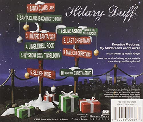 Details: Amazon.ca Hilary Duff, the winsome star of the Disney Channel's Lizzie McGuire, makes her singing debut with a rather frothy mix of original songs and old holiday chestnuts--only these chestnuts aren't roasting on an open fire, they' re sugarcoated, like everything else on this pop-light album. Duff, who looks like Jessica Simpson, and sings like Mandy Moore, sticks close to the tried-and-true versions of Santa Claus is Coming To Town," "Jingle Bell Rock," and Sleigh Ride," adding little to the holiday music cannon. The album only perks up when Duff's guests appear: Christina Milian pushes Duff to greater heights on the crisp and rhythmically innovative "I Heard Santa on the Radio," and Lil' Romeo adds some spiky dynamics and humor as he raps through "Tell Me a Story (About the Night Before)." --Jaan Uhelszki Product Description Duff, Hilary