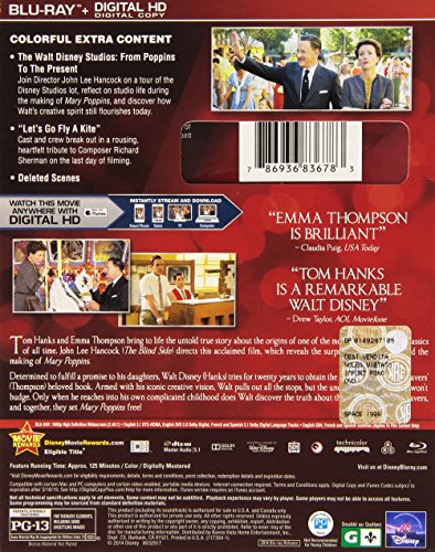 Details: Tom Hanks and Emma Thompson bring to life the untold true story about the origins of one of the most treasured Disney classics of all time. John Lee Hancock (The Blind Side) directs this acclaimed film that reveals the surprising backstory behind the making of Mary Poppins. Determined to fulfill a promise to his daughters, Walt Disney (Hanks) tries for 20 years to obtain the rights to author PL Travers' (Thompson) beloved book. Armed with his iconic creative vision, Walt pulls out all the stops, but the uncompromising Travers won't budge. Only when he reaches into his own complicated childhood does Walt discover the truth about the ghosts that haunt Travers, and together, they set “Mary Poppins” free!
