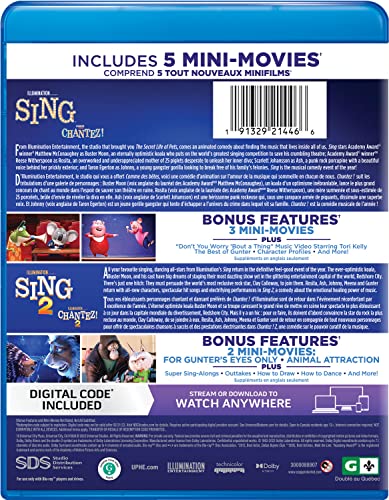 Details: Product Description "A two-movie collection featuring Illumination's Sing and Sing 2. When an eternally optimistic koala puts on a singing competition to save his failing theater, animals across the city gather to step into the spotlight and chase their dreams! Can -do koala Buster Moon and his all-star cast of animal performers prepare to launch a dazzling stage extravaganza in the glittering entertainment capital of the world. There's just one hitch -- he has to find and persuade the world's most reclusive rock star to join them." Special Features Disc 1 - Sing: The Making of SingFinding the Rhythm: Editing SingCharacter Profiles"Don't You Worry 'Bout a Thing" Music VideoMaking a Music Video with Tori Kelly"Faith" Music Video"Faith" Lyric Video"Set It All Free" Lyric VideoSing & Dance! - "Faith"The Sing NetworkThe Best of Gunter"Gunter Babysits" Mini-Movie"Love At First Sight" Mini-Movie"Eddie's Life Coach" Mini MovieThe Making of the Mini-MoviesDisc 2 - Sing 2: Includes Blu-ray, DVD and a digital copy of Sing 2 (Subject to expiration. Go to NBCUCodes.com for details.)"For Gunter's Eyes Only" Mini-Movie"Animal Attraction" Mini-MovieOuttakesMeet the AnimatorsSuper Sing-AlongsHow to Dance & MoreThe Voices of Sing 2From the Drawing RoomHow to Draw]]>
