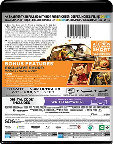 Details: Never have there been five friends as infamous as The Bad Guys—Mr. Wolf, Mr. Snake, Mr. Piranha, Mr. Shark and Ms. Tarantula. After years of countless heists and being the world's most-wanted villains, the gang is finally caught. Mr. Wolf brokers a deal to keep them out of prison and the Bad Guys set out to fool the world into believing they've gone good. Packed with huge laughs and edgy action, being bad has never been so fun in this action-comedy from DreamWorks Animation based on the best-selling Scholastic book series. Bonus Content: Features High Dynamic Range (HDR10) for Brighter, Deeper, More Lifelike Color Maraschino Ruby Deleted Scenes Devise the Plan: Making The Bad Guys Assemble the Crew It's Showtime: Cast Table Read Snake's Frozen Pop Shop From The Drawing Room Feature Commentary with Director Pierre Perifel, Producer Damon Ross, Head of Story Nelson Yokota, Head of Character Animation JP Sans and Production Designer Luc Desmarchelier ]]>