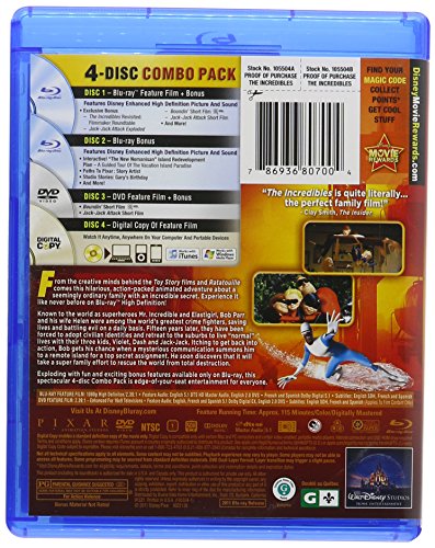 Details: From the creative minds behind the TOY STORY films and RATATOUILLE comes this hilarious, action-packed animated adventure about a seemingly ordinary family with an incredible secret. Experience like never before on Blu-ray(TM) High Definition! Known to the world as superheroes Mr. Incredible and Elastigirl, Bob Parr and his wife Helen were among the world's greatest crime fighters, saving lives and battling evil on a daily basis. Fifteen years later, they have been forced to adopt civilian identities and retreat to the suburbs to live "normal" lives with their three kids, Violet, Dash and Jack-Jack. Itching to get back into action, Bob gets his chance when a mysterious communication summons him to a remote island for a top secret assignment. He soon discovers that he will take a super family effort to rescue the world from total destruction. Exploding with fun and exciting bonus features available only on Blu-ray, this spectacular 4-disc Combo Pack is edge-of-your-seat entertainment for everyone.