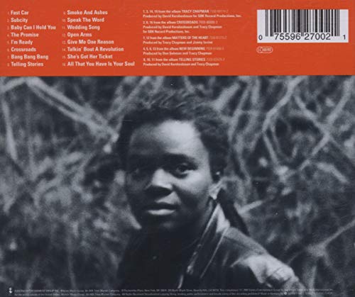 Details: Amazon.ca Some albums just can't be bettered. Tracy Chapman's 1988 self-titled debut is one of them. Led by poignant singles "Fast Car", "Baby Can I Hold You Tonight" and "Talkin' Bout a Revolution", its fragile acoustic laments tugged at the heart-strings and established Chapman as a songwriter with a uniquely human touch--selling 10 million copies and picking up three Grammies in the process. As this collection illustrates, such genius sets a difficulty precedent. Despite including some truly beautiful songs from her four subsequent albums, the impact of those emotive early singles still dwarfs everything here. "I'm Ready" and "Smoke and Ashes" line up as the best of the rest, but with "Speak The Word", "Wedding Song" and "Open Arms" brimming with tender melodies and sentiments that touch in a way that most songwriters can only dream of, it's a close run thing. "Fast Car" & Co. may be untouchable, but with the quiver in her voice adding a depth of emotion to her words of love, need and hope, these 16 tracks make n salient point: with Tracy Chapman, there is no such thing as an average song. --Dan Gennoe Product Description Import-only collection from the acclaimed singer/songwriter spanning the first 12 years of her successful career and featuring tracks from her first five albums that she recorded for the Elektra label. When Tracy first appeared on the music scene in 1988, her self-titled debut album was heavily influenced by the classic singer/songwriter scene of the '70s and was a refreshing alternative to the over-produced dross that most of the labels were releasing at the time. 16 tracks including her first big hit 'Fast Car' plus other radio hits and great album tracks like 'Crossroads', 'Telling Stories' and 'Give Me One Reason'. Warner. 2001.