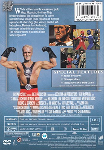 Details: While having a blast at their favorite amusement park, Mega Mountain, the Ninja brothers witness the kidnapping of TV action superstar Dave Dragon (Hulk Hogan) by evil Lothar Zogg (Jim Varney) and his kid-hating boss, Medusa (Loni Anderson). When Medusa's henchmen surround the park and demand $10 million from the park's owner, the Ninjas strike back with a vengeance. Join Rocky, Colt and TumTum for a rollercoaster ride of fun, action and comedy. 3 NINJAS: HIGH NOON AT MEGA MOUNTAIN is an awesome follow-up to the hits 3 Ninjas, 3 Ninjas Kick Back and 3 Ninjas Knuckle Up.
