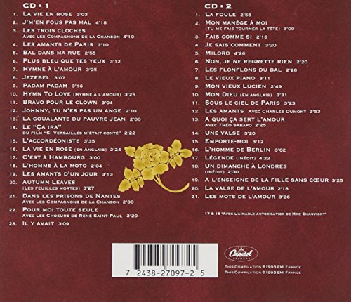 Details: Amazon.ca Abandoned as a baby and raised in a brothel, Piaf was dicovered singing in the streets of Paris by a club owner, who started her 30-year career during which time she became France's best-loved and best-known songstress, with major hits from beginning to end. At times singing in front of the band with no microphone, her powerful voice and emotional delivery was a striking contrast to her diminutive size. Nicknamed "the Little Sparrow," Piaf was plagued by controversy, from implications in a clubowner's death to multiple affairs (including Yves Montand and Charles Aznavour), drugs, and alcohol. Her torchy cabaret and dramatically theatrical songs eventually won her global recognition. This two-CD set covers highlights of her career up to her death in 1963, many of which are now standards. Described in France as "the greatest figure in the history of song," her voice still rings with a passion for life, something that eventually consumed her. --Derek Rath