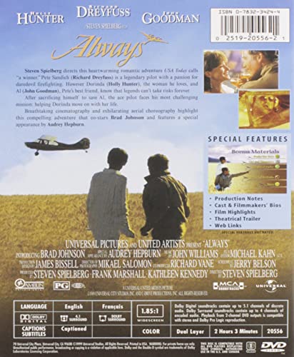 Details: Amazon.ca Considered by many to represent a low point in Steven Spielberg's career, 1990's Always did suggest something of a temporary drift in the director's sensibility. A remake of the classic Spencer Tracy film A Guy Named Joe, Always stars Richard Dreyfuss as a Forest Service pilot who takes great risks with his own life to douse wildfires from a plane. After promising his frightened fiancée (Holly Hunter) to keep his feet on the ground and go into teaching, Dreyfuss's character is killed during one last flight. But his spirit wanders restlessly, hopelessly attached to and possessive of Hunter, who can't see or hear him. Then the real conflict begins: a trainee pilot (Brad Johnson), a likable doofus, begins wooing a not-unappreciative Hunter--and it becomes Dreyfuss's heavenly mandate to accept, and even assist in, their budding romance. The trouble with the film is a certain airlessness, a hyper-inventiveness in every scene and sequence that screams of Spielberg's self-education in Hollywood classicism. Unlike the masters he is constantly quoting and emulating in Always, he forgets to back off and let the movie breathe on its own sometimes, which would better serve his clockwork orchestration of suspense and comedy elsewhere. Still, there are lovely passages in this film, such as the unforgettable look on Dreyfuss's face a half-second before fate claims him. John Goodman contributes good supporting work, and Audrey Hepburn makes her final screen appearance as an angel. --Tom Keogh Product Description Steven Spielberg directs this heartwarming romantic adventure USA Today calls "a winner". Pete Sandich (Richard Dreyfuss) is a legendary pilot with a passion for daredevil firefighting. However Dorinda (Holly Hunter), the woman he loves, and Al (John Goodman), Pete's best friend, know that legends can't take risks forever. After sacrificing himself to save Al, the ace pilot faces his most challenging mission: helping Dorinda move on with her life. Breathtaking cinematography and exhilarating aerial choreography highlight this compelling adventure that co-stars Brad Johnson and features a special appearance by Audrey Hepburn. Special Features Production Notes Cast and Filmmakers Theatrical Trailer