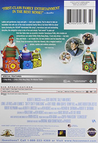 Details: Amazon.ca This remastered, pan-and-scan 30th-anniversary edition of that kiddie-car caper is flawed but solid family fare. It retains a quaint charm while some of the songs--including the title tune--are quite hummable. A huge plus is Dick Van Dyke, who is extremely appealing as an eccentric inventor around the turn of the century. With nimble fingers and a unique way of looking at the world, he invents for his children a magic car that floats and flies. Or does he? The special effects are tame by today's standards, and the film is about 20 minutes too long--but its enthusiasm charms. The script was cowritten by Roald Dahl and based on the novel by Ian Fleming, best known for his James Bond adventures. --Rochelle O'Gorman Product description Chitty Chitty Bang Bang