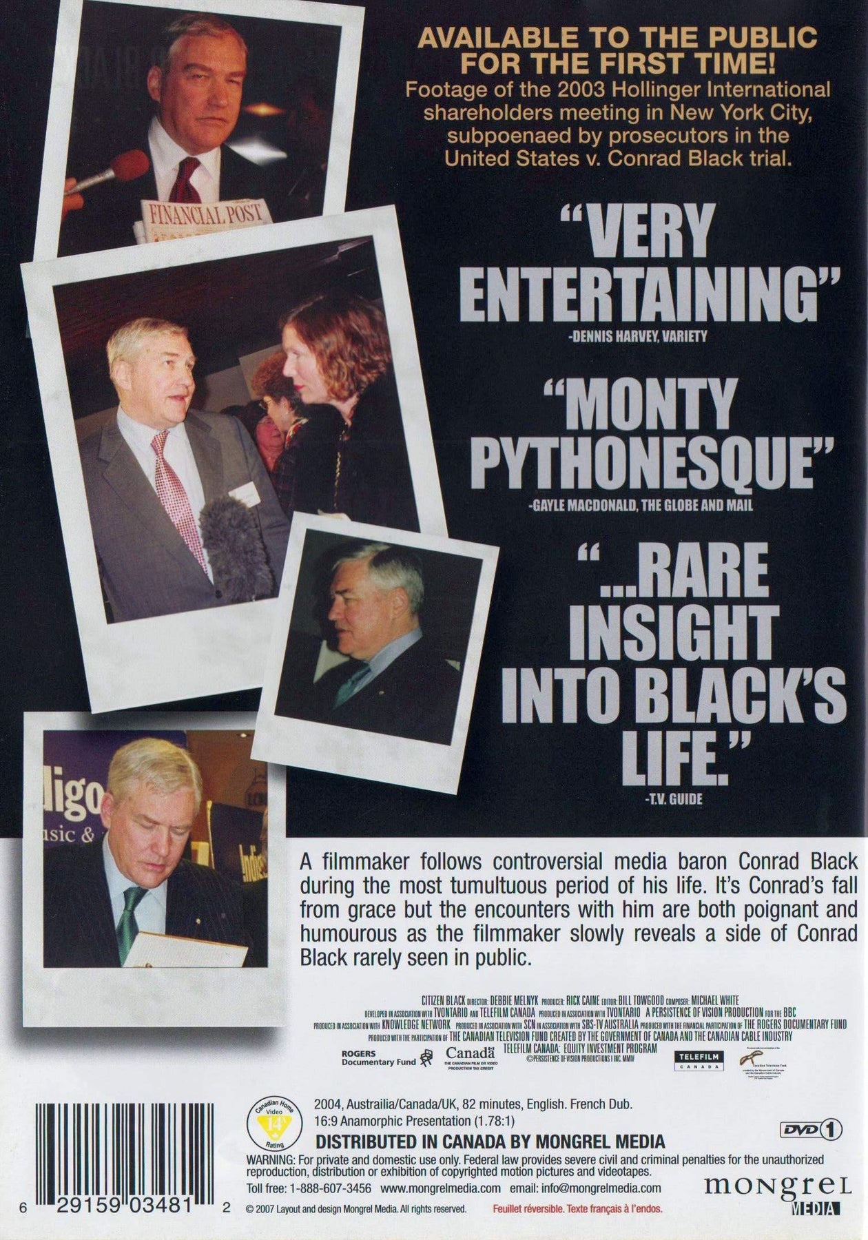 Details: Product Description A filmmaker follows controversial media baron Conrad Black during the most tumultuous period of his life. It's Conrad's fall from grace but the encounters with him are both poignant and humourous as the filmmaker slowly reveals a side of Conrad Black rarely seen in public. ------------------------ Citizen Black est un profil biographique insolite de l’extravagant magnat de la presse et lord britannique, Conrad Black. Cette biographie révélatrice, provocante et humoristique présente les succès et les échecs, les marottes et les folies de l’un des hommes les plus riches et l’un des éditeurs les plus influents au monde. Lord Black de Crossharbour est en quelque sorte une version moderne et bien réelle du Citoyen Kane. Il est grand temps que nous fassions la lumière sur cet homme au lieu de nous contenter du mythe. Review "Very entertaining" -- Dennis Harvey, Variety