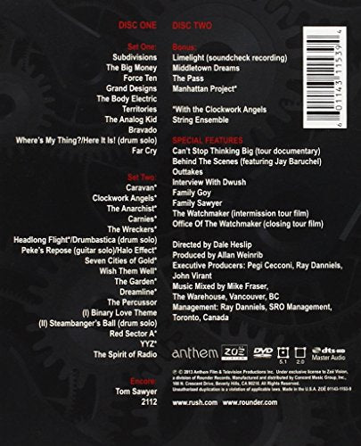 Details: "Rush: Clockwork Angels Tour" captures the Rock & Roll Hall of Famers' 2012-2013 sold-out tour from a unique point-of-view approach to filmmaking utilizing distinct composition and a voyeuristic style that at varying moments puts the viewer on the stage, at the side of the stage, and throughout the arena. For the first time ever the legendary band (Geddy Lee, Alex Lifeson, Neil Peart) was accompanied on this tour by an eight-piece string section! This electrifying 2-DVD or single Blu-ray concert (both formats contain the same content) features over 3 hours of music including favorites "Tom Sawyer" and "The Spirit of Radio", 3 drum solos, new string arrangements of classics such as "YYZ", "Dreamline" and "Red Sector A", and rarely performed songs such as "The Body Electric" and "Middletown Dreams." Extensive bonus features include a full version of "Limelight" from soundcheck and an exclusive backstage documentary shot throughout Europe. With over 40 million albums sold worldwide and more consecutive gold and platinum awards than any other rock band following The Beatles and The Rolling Stones, Rush remains one of the most inventive, compelling, and relevant musical groups today.