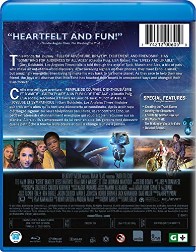 Details: Product Description When a construction project begins digging in their neighborhood, best friends Tuck (Astro), Munch (Reese Hartwig) and Alex (Teo Halm) start to get strange, encoded messages on their cell phones. Convinced something bigger is going on, they tell their parents and the authorities, but no one will take them seriously. The three friends set off to crack the code and follow it to its source. But they soon find themselves in way over their heads when they discover an alien from another world who needs their help. Special Features Creating the Truck Scene Casting the Characters Friends No Matter How Far We Made That!: The Making of Earth to Echo Deleted Scenes