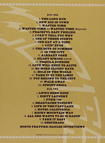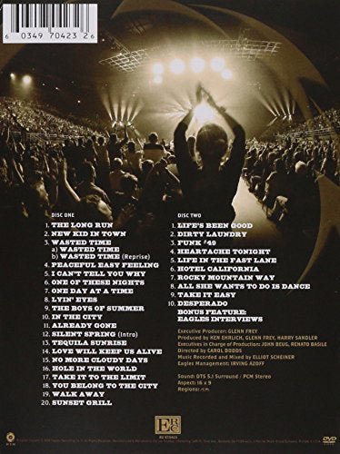 Details: Without doubt, the Eagles are one of the all-time biggest acts in popular music since the dawn of the rock'n'roll era. The band's roots go back to their role as defining artists in the phenomenally popular Southern California rock scene of the '70s, a decade in which they delivered four consecutive #1 albums. Their momentous 2004 farewell tour filled stadiums around the world, and this 2-DVD set captures one of the most stellar events from that now-historic global sweep. Track Listings: Disc 1: Long Run, New Kid in Town, Wasted Time, Peaceful Easy Feeling, I Can't Tell You Why, One of These Nights, One Day At A Time (New Track), Lyin' Eyes, Boys of Summer, In The City, Already Gone, Tequila Sunrise, Love Will Keep Us Alive, No More Cloudy Days (New Track), Hole In the World, Take It To the Limit, Disc 2: You Belong to the City, Walk Away, Sunset Grill, Life's Been Good, Dirty Laundry, Funk #49, Heartache Tonight, Life in the Fast Lane, Hotel California, Rocky Mountain Way, All She Wants To Do Is Dance, Take It Easy, Desperado.