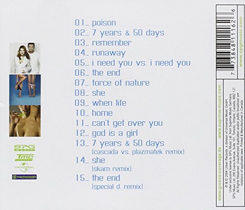Details: This album features the radio hits that have charted in the top 20 of Z103.5s Top 40 Countdown:- Poison Runaway God Is A Girl The End· Plus the European hit singles She & 7 Years & 50 Days, which was a summer anthem in Europe over the past few months. Included on this Canadian edition of this album are 3 bonus remixes only featured on the Canadian release including one by the producers CASCADA who have achieved Top 40 status with the hit Every Time We Touch.· Groove Coverage is part of a fresh wave of German dance acts that have put Germany back on the musical map with world-wide hits.· Groove Coverage is masters of the EuroPop Trance perfection recipe these ingredients include a infectious phat synth riffs, a bangin beat and captivating diva vocals.