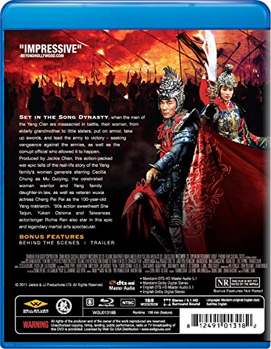 Details: Product Description Set in the Song Dynasty, when the men of the Yang Clan are massacred in battle, their women, from elderly grandmother to little sisters, put on armor, take up swords, and lead the army to victory seeking vengeance against the armies, as well as the corrupt official who allowed it to happen. Produced by Jackie Chan, this action-packed war epic of the real-life story of the Yang family s women generals stars Cecilia Chung as Mu Guiying, the celebrated woman warrior and Yang family daughter-in-law, as well as veteran wuxia actress Cheng Pei Pei as the 100-year-old Yang matriarch. '90s action sweetheart She Taijun, Yukari Oshima and Taiwanese actor/singer Richie Ren also star in this epic and legendary martial arts spectacular. Special Features Behind the Scenes Trailer