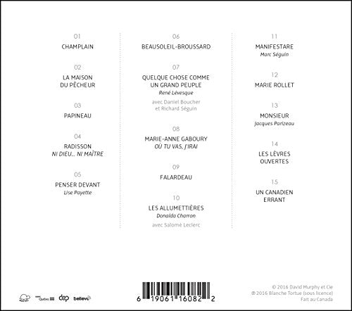 Details: Légendes d'un peuple est un projet réalisé par l'auteur-compositeur-interprète Alexandre Belliard. Sur disque et sur scène sont chantés les personnages qui ont marqué, par leur courage, leur détermination, leur créativité et leur ambition, l'Histoire des francophones des Amériques. Depuis la création des Légendes d’un peuple par Alexandre Belliard, ce sont 55 chansons qui ont été enregistrées et publiées sur 5 albums distincts. Pour souligner ce succès, Alexandre offre aujourd’hui une rétrospective de son projet sur un seul disque. Réalisé par Hugo Perreault (Okoumé, Richard Séguin), cette anthologie présente 15 chansons parmi les plus marquantes des 5 tomes des Légendes d’un peuple. Parmi ces chansons, nous retrouvons la pièce hommage à René Lévesque « Quelque chose comme un grand peuple » sur laquelle on peut entendre les voix de Daniel Boucher et de Richard Séguin. Premier extrait radio diffusée depuis septembre, la pièce Les allumettières, tirée du tome IV des Légendes d’un peuple et chantée en duo avec Salomé Lerclerc, est un hommage poignant et sincère au courage et à la solidarité ouvrière.
