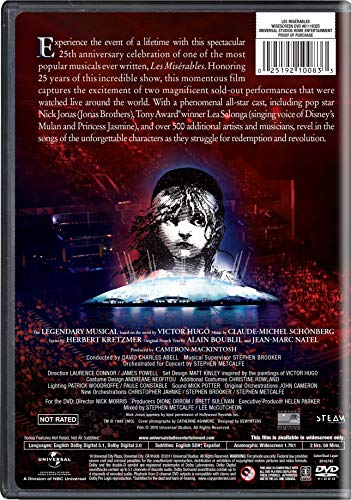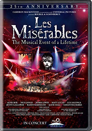 Details: Product Description Experience the event of a lifetime with this spectacular 25th anniversary celebration of one of the most popular musicals ever written, Les Misérables. Honoring 25 years of this incredible show, this momentous film captures the excitement of two magnificent sold-out performances that were watched live around the world. With a phenomenal all-star cast, including pop star Nick Jonas (Jonas Brothers), Tony Award winner Lea Salonga (the voice of Disney’s Mulan and Princess Jasmine), and over 500 additional artists and musicians, revel in the songs of the unforgettable characters as they struggle for redemption and revolution. Amazon.ca Fifteen years after the historic 10th anniversary concert, the international musical sensation Les Misérables returned for a 25th anniversary concert at London's O2 Arena in October 2010. Like the previous concert, it presents an all-star cast, this time taken from two different 2010 London productions as well as the original 1985 cast. The singers stand at microphones wearing costumes, backed by a huge chorus and three video screens showing some action that can't be represented on stage, though the stage is transformed into a set for some key scenes, such as in the Thénardiers' bar and at the barricade. And as it has for 25 years, Alain Boublil and Claude-Michel Schönberg's score vividly captures the passion of Victor Hugo's epic tale of post-Revolutionary France, combining tear-jerking ballads ("I Dreamed a Dream," "Bring Him Home") and rousing anthems ("Do You Hear the People Sing"). The cast is nearly all excellent, including Alfie Boe as Jean Valjean, Norm Lewis as Javert, Matt Lucas as Thénardier, Jenny Galloway as Madame Thénardier (reprising her role from 1995), and Katie Hall as Cosette. Teen pop star Nick Jonas (of the Jonas Brothers) seems to have been cast as Marius for box-office appeal, however. Though he has the right look and hits the right notes, his voice is weak compared to the rest of the cast and throughout the show he seems to wear the same look of earnest worry, eyes fixed on the horizon as if reading a teleprompter. After playing Eponine in the 1995 concert, Lea Salonga is now Fantine, and while she sings well, the part really calls for more vocal power. Comparing the 1995 concert and 2010, the newer one has superior audio and video, but the earlier one has the stronger cast top to bottom, anchored by many of the legendary performers who helped make Les Mis the sensation it still is today. In acknowledgment of that, after the final scene of the 2010 concert ends, many of the original cast members enter the stage for a thrilling encore. "Bring Him Home" unites original Valjean Colm Wilkinson with John Owen-Jones, Simon Bowman, and Alfi Boe, then Michael Ball, Frances Ruffelle, Alun Armstrong, and others join the cast for "One Day More." (It's hard not to be moved when Ball looks around the stage and sings his line, "My place is here, I fight with you.") Producer Cameron Mackintosh and authors Boublil, Schönberg, and Herbert Kretzmer all address the crowd before a throng of student performers (appropriate, no?) comes on stage to close the nearly three-hour evening. --David Horiuchi Special Features A Whiz Thru Miz