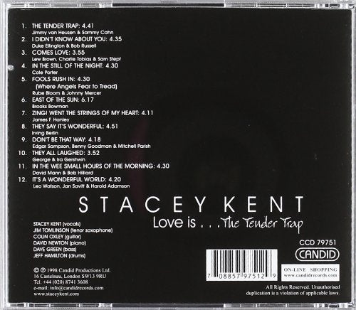 Details: Product Description It's only her second album, but what an impact she has had on the jazz world. Ms. Kent's natural vocal abilities are in full force once more on this wonderful collection. While the songs are quite familiar to most, she breathes new life into each one with a distinctive voice, superb diction and sublime performance. If you're a fan of how they used to make 'em, guess what? They're still making em like they used to...and just as good! Amazon.ca With the passing years the definition "jazz singer" has taken on wider meaning. Purists once maintained that it covered only the vocals of Louis Armstrong, Billie Holiday and a handful of others. Nowadays it quite legitimately refers to a host of fine singers whose musicianship allows them to take liberties with the relationship of notes to bar lines and the "bending" of a lyric to fit a paraphrase of the melody as written. Stacey Kent, a young American lady resident in Britain, is a jazz singer and responds to the jazz musicians with whom she works and to the material that she uses. The Tender Trap is made up of a dozen quality songs of the kind that jazz musicians like to play. On eight of them her husband Jim Tomlinson, a tenor saxist of considerable talent, joins her. Stacey Kent is not afraid to tackle difficult songs which started life as instrumentals (Edgar Sampson's "Don't Be That Way" and Duke Ellington's "I Didn't Know About You"). For quiet intimacy there is an outstanding version of "Wee Small Hours" on which she is accompanied only by pianist Dave Newton. An outstanding record of vocal artistry. -- Steve Voce