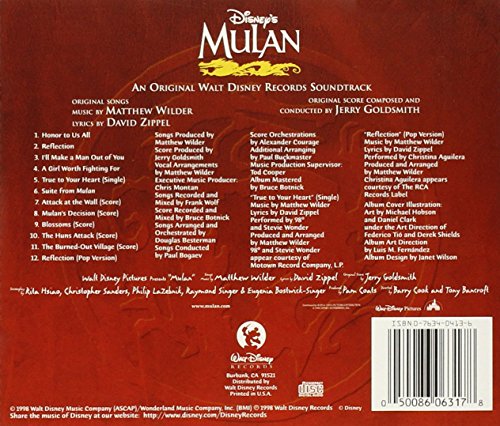 Details: Amazon.ca Lea Salonga, best known as the voice of Jasmine in Aladdin, steals the show here as the title character in Disney's Mulan. The former star of Miss Saigon adds touching elements to the feature, especially on introspective numbers such as "Reflection." Unfortunately, the voice of Donny Osmond, relegated to anthems such as "I'll Make a Man Out of You" doesn't really enhance the story line, a saga set in ancient China. Jerry Goldsmith provides the Far East tinge to the score, almost reminiscent of early Les Baxter. While Mulan is a far cry from the memorable Beauty and the Beast, it is both funny and charming. --Jason Verlinde Product Description William Goldsmith