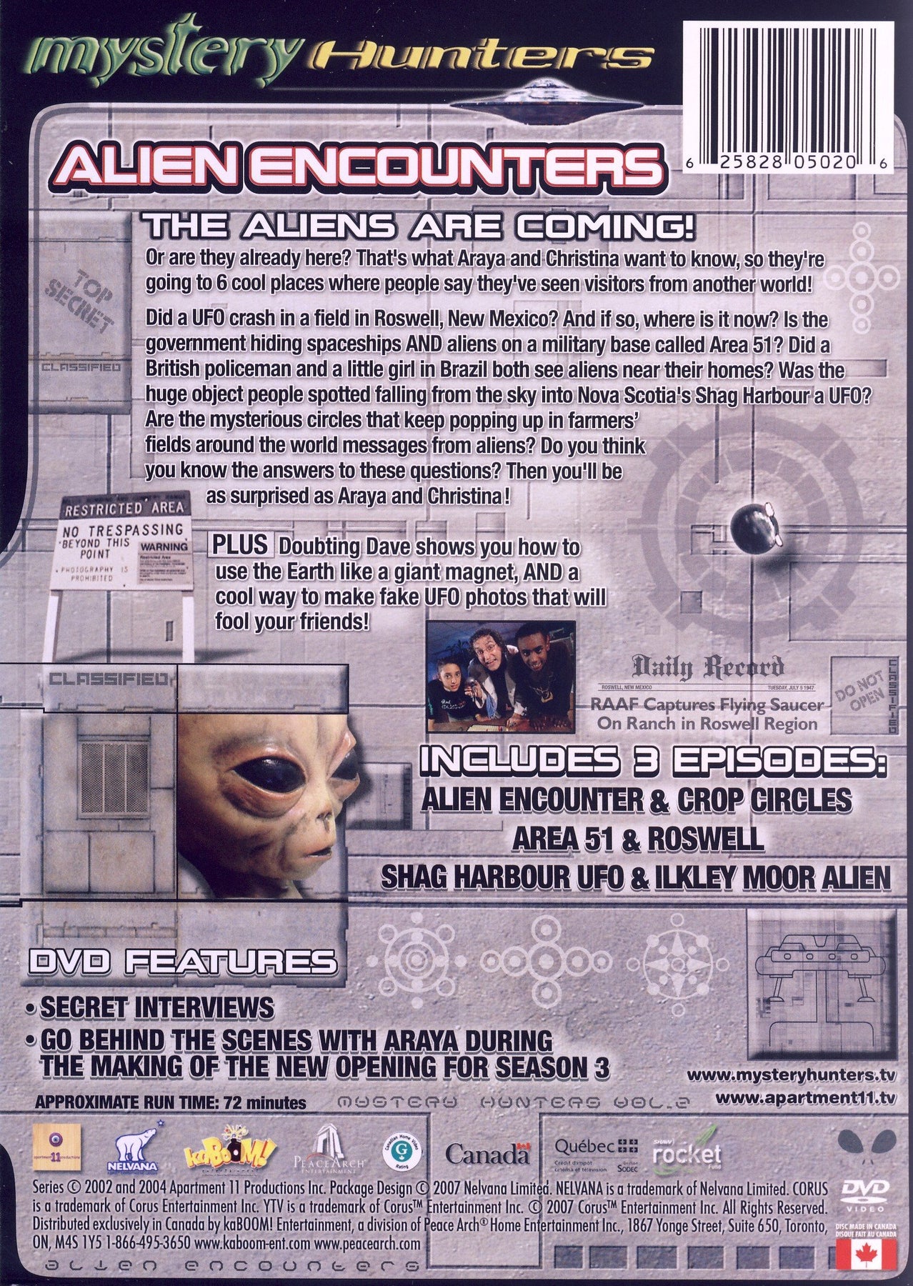 Details: From the Studio THE ALIENS ARE COMING! Or are they already here? That's what Araya and Christina want to know, so they're going to 6 cool places where people say they've seen visitors from another world! Did a UFO crash in a field in Roswell, New Mexico? And if so, where is it now? Is the government hiding spaceships AND aliens on a military base called Area 51? Did a British policeman and a little girl in Brazil both see aliens near their homes? Was the huge object people spotted falling from the sky into Nova Scotia's Shag Harbour a UFO? Are the mysterious circles that keep popping up in farmers’ fields around the world messages from aliens? Do you think you know the answers to these questions? Then you'll be as surprised as Araya and Christina were! Plus Doubting Dave shows you how to use Earth's magnetic power just like UFOs might, AND a cool way to make fake UFO photos that will fool your friends!