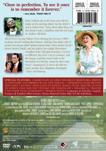 Details: Amazon.ca Winner of the Academy Award® for best picture of 1989, this gracefully moving drama, adapted from the hit play by Alfred Uhry, chronicles the 25-year friendship between a stubborn, aging Southern widow (Jessica Tandy) and her loyal chauffeur (Morgan Freeman). At first, the self-sufficient Miss Daisy is reluctant to accept the services of a chauffeur, but Hoke is quiet, wise, and tolerant, and as the years pass the unlikely friends develop a deep mutual respect and admiration. Tandy deservedly won the Oscar for her sassy and sensitive performance, and Freeman earned an Oscar nomination for bringing quiet depth and integrity to his memorable role. Ironically, director Bruce Beresford (Tender Mercies) was not nominated, but the film won Oscars for makeup and for Uhry's screenplay, in addition to a supporting actor nomination for Dan Aykroyd as Daisy's supportive son. Delicate, funny, and bittersweet, Driving Miss Daisy was a surprise hit when released, and marked the crowning achievement of Tandy's great career. --Jeff Shannon Product description Driving Miss Daisy (1989)
