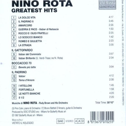 Details: Greatest Hits of Nina Rota's Soundtrack Music Featuring Music from the Films La Dolce Vita, 8 1/2, La Strada, Il Gattopardo, Boccaccio 70, And Many Others.