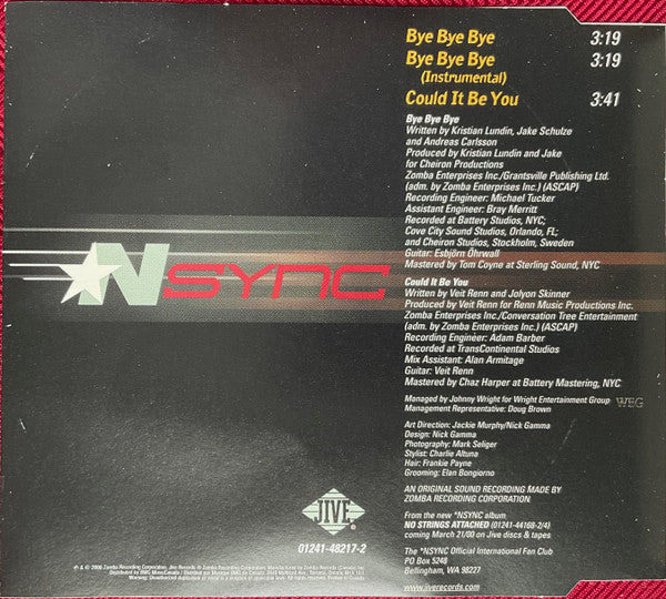 "Bye Bye Bye" published by Zomba Enterprises Inc. / Granstville Publishing Ltd. (adm. by Zomba Enterprises Inc.) (ASCAP). Produced for Cheiron Productions. Recorded at Battery Studios, NYC; Cove City Sound Studios, Orlando, FL and Cheiron Studios, Stockholm, Sweden. Mastered at Sterling Sound, NYC. "Could It Be You" published by Zomba Enterprises Inc. / Conversation Tree Entertainment (adm. by Zomba Enterprises Inc.) (ASCAP). Produced for Renn Music Productions Inc. Recorded at TransContinental Studios. Mastered at Battery Mastering, NYC. From the new *NSYNC album "No Strings Attached" (01241-44168-2/4) coming March 21/00 on Jive discs and tapes. An original sound recording made by Zomba Recording Corporation. ℗&© 2000 Zomba Recording Corporation. Manufactured by Zomba Records (Canada) Inc. Distributed by BMG Music Canada / Distribué par Musique BMG du Canada. Printed in Canada.