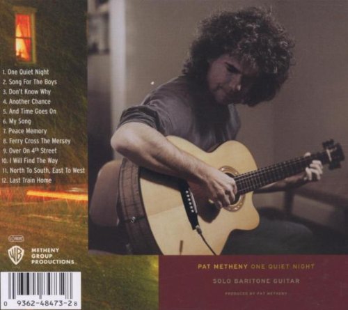 Details: Amazon.ca Pat Metheny literally sat down One Quiet Night to record some solo guitar in his home studio. Using a semi-acoustic baritone made by the esteemed Canadian luthier Linda Manzer, he recorded most of these pieces towards the end of 2001. After returning from a lengthy tour Metheny was impressed with the results and decided to add six more tunes to make an album's worth of material. It's as calming as you might expect, with Pat investigating a more esoteric tuning mode and playing pure, with no overdubs. His lone axe is given a big, reverb-soaked sound, acting like a virtual orchestra in a cavernous space. The bass strings resonate with a plump power, silvery high-string phrases dancing above. Metheny deliberately avoids any flashy fingerpicking, concentrating on gentle plucks, savouring the scrape, rub and click of his strings and allowing gaps for thought. He's completely relaxed and spontaneous, sustaining a mellow mood throughout. Around the midway mark of "Time Goes On" and Keith Jarrett's "My Song", the ideas seem to get cut adrift, yearning for bold gestures or emphatic statements. One problem is that Metheny doesn't vary the sound zones that he's exploring. On "Peace Memory", ascending lines never quite reach their conclusion, but climb back up from the bottom again, then "Over on 4th Street" introduces a vigorous strum, underpinned by seeping bass notes. "I Will Find the Way" rejoices in singing harmonics, producing a luminous stasis that's in sharp contrast with "Ferry Cross the Mersey", which is certainly an unexpected song-choice for Metheny. --Martin Longley Product Description Pat Metheny