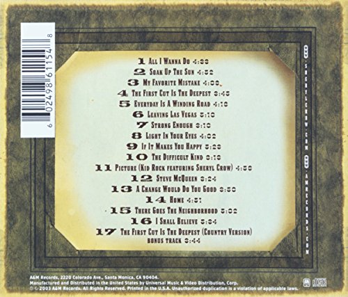 Details: Product Description It took Sheryl years to graduate from session singer to star, but boy did she graduate with honors: a string of Grammys and platinum LPs! 16 hits and favorites from all her albums are here: Leaving Las Vegas; All I Wanna Do; Strong Enough; If It Makes You Happy; Soak Up the Sun; Favorite Mistake; Everyday Is a Winding Road; A Change Would Do You Good; Picture (with Kid Rock); two unissued tracks, and more! Amazon.ca Despite the photographic presence of an acoustic guitar (the rock & roll equivalent of a rubber bullet), the enviably lovely hair and the unassuming knitwear, Sheryl Crow is staring back at us from the cover of The Very Best Of with her chin resting on a fist clenched tightly with white-knuckled defiance. This is, after all, the girl whose wishful thinking led her to sing "All I wanna do is have some fun" while privately preferring to either curl up in bed for a very long time or roll over and die (she's recently come out of the closet with regards to her longstanding battles with depression). Yes, she's earned herself an armful of Grammys and has been damned with faint praise, but if you go easy on the relatively troublesome second-half of Sheryl Crow's 10-year solo career (the poppy optimism of songs like "C'mon C'mon" and "Soak Up the Sun" seems strained), then this decade-acknowledging resumé serves as a reminder of her narrative talents for summarising the pitfalls of burdensome workloads ("Everyday Is a Winding Road") and problematic squeezes ("My Favourite Mistake") within an MTV-friendly pop framework. Questionably, such gems as the James Bond theme "Tomorrow Never Dies" and the US abortion issue commentary of "Hard to Make a Stand" (both sizeable UK hits) have been omitted to make room for three new tracks, two of which, the evangelical "Light in Your Eyes" and the post-9/11 "Let's Get Free" betray the influences of George Harrison and the Beatles. --Kevin Maidment