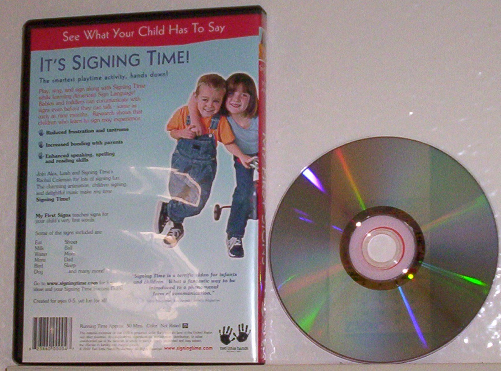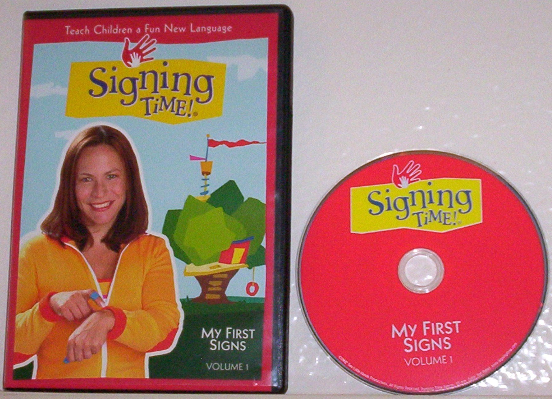 Details: The first in the Signing Time! series. Cousins Alex Brown (who can hear) and Leah Coleman (who is deaf) invites babies and children of all ages to "Come sign with us!" My first Signs presents 18 basic American Sign Language (ASL) signs to your family in a fun and memorable way. It's Signing Time: My First Signs - ASL signs you can use everyday! The ASL signs taught are: Eat, Milk, Water, Ball, More, Bird, Dog, Cat, Fish, Car, Airplane, Want, Shoes, Flower, Mom, Dad, Baby, Sleep The DVD version includes an ASL sign review.