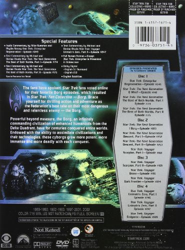 Details: Star Trek: Fan Collective: Borg 4 DVD DISC BREAKDOWN DISC 1 Regeneration - Star Trek Enterprise 049 Audio Commentary by Mike Sussman and Phyllis Strong Q Who? - Star Trek The Next Generation 142 The Best of Both Worlds, Part I - Star Trek The Next Generation 174 Text Commentary by Michael and Denise Okuda The Best of Both Worlds, Part II - Star Trek The Next Generation 175 Text Commentary by Michael and Denise Okuda DISC 2 I Borg - Star Trek The Next Generation 223 Descent, Part I - Star Trek The Next Generation 252 Descent, Part II - Star Trek The Next Generation 253 Scorpion, Part I - Star Trek Voyager 168 DISC 3 Scorpion, Part II - Star Trek Voyager 169 Drone - Star Trek Voyager 196 Dark Frontier - Star Trek Voyager 824 DISC 4 Unimatrix Zero, Part I - Star Trek Voyager 246 Unimatrix Zero, Part II - Star Trek Voyager 247 Text Commentary by Michael and Denise Okuda Endgame - Star Trek Voyager 828
