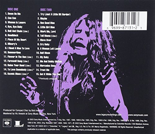 Details: Amazon.ca Such was the visceral power of Janis Joplin's voice that her enduring legend as '60s rock icon was based on just a pair of solo albums and the two releases with her fronting Big Brother and the Holding Company that she recorded before her death in 1970 of a drug overdose. This 30-track double-disc anthology offers a concise introduction to the incendiary talents of a singer whose tortured blues seemed no mere affectation; being cruelly voted "Ugliest Man on Campus" during her tenure at the University of Texas barely hinted at the depth of Joplin's personal demons. Organized chronologically with its discs split between her band and solo careers, the anthology documents the story of a raw, riveting talent that carried the often slovenly psychedelic blues of Big Brother to stardom via "Down on Me" and "Piece of Heart," stumbled only slightly on her solo debut (I Got Dem Ol' Kozmic Blues Again Mama), and then reached full, ragged glory on the quintessential Pearl with tracks like her posthumous hit "Me and Bobby McGee" and the playful "Mercedes Benz." The collection also features a pair of previously unreleased live Big Brother tracks ("To Love Somebody," "Kozmic Blues") recorded at Woodstock '69. --Jerry McCulley Product Description Joplin, Janis