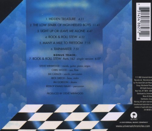 Details: Amazon.ca Despite not even charting in the band's native England, this album became a platinum-selling American hit on the basis of three enduring FM radio staples--the expansive, jazzy impressionism of the near-12 minute title track, and the more straightforward funk of the R&B charmers "Light Up or Leave Me Alone" and "Rock & Roll Stew." Those disparate tracks perfectly underscore Traffic's rich musical appeal and its restless, sometimes problematic creative and interpersonal relationships. With now thrice-departed Dave Mason out of the mix and percussionists Jim Gordon and Reebop Kwaku Baah participating in the studio for the first time, the band's innate musicality truly takes wing. Winwood's familiar vocal phrasings nearly take a backseat to his fluid, dramatic guitar work on "Rock & Roll Stew Roll" and "Many a Mile to Freedom," while the Tull-ish, folk-madrigal sensibilities of "Hidden Treasure" and "Rainmaker" are further punctuated by Chris Wood's deft flute and woodwind flourishes. Compared with the more organic John Barleycorn album, the contrast is all the more remarkable. While many contemporary bands were experimenting with various attempts at fusion, few achieved this collection's rock-jazz-folk-R&B range or level of often subtle sophistication. Digitally remastered, this edition also contains the six-minute-plus U.S. single version of "Rock & Roll Stew, Parts 1 & 2" as a bonus track. --Jerry McCulley Product Description Steve Winwood and the band delivered a stellar set of songs on this 1971 LP, from the funky hit Rock & Roll Stew-Pt. 1 to the Capaldi-penned Light Up or Leave Me Alone to the sprawling title gem.