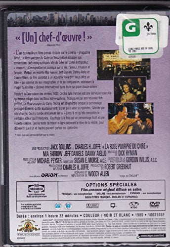 Details: La Rose pourpre du Caire (The Purple Rose of Cairo) est un film américain de Woody Allen de 1985. Dans les années 1930 aux États-Unis, pendant la Grande Dépression, une jeune serveuse de brasserie, Cécilia, a un mari chômeur et tire-au-flanc. Elle se console en passant ses soirées au cinéma, sa grande passion. Un jour où elle est venue revoir, pour la cinquième fois, le même film au Jewel Palace, un incident extraordinaire se produit: l'un des personnages de La Rose pourpre du Caire, Tom Baxter, l'interpelle dans la salle. Il sort de l'écran, passe du film en noir et blanc au monde en couleurs et l'entraîne dans une aventure aux rebondissements imprévus. *********The Purple Rose of Cairo is a 1985 American romantic fantasy comedy film written and directed by Woody Allen. Inspired by Sherlock, Jr., Hellzapoppin', and Pirandello's Six Characters in Search of an Author, it is the tale of a film character who leaves a fictional film of the same name and enters the real world. Cecilia is a waitress in New Jersey during the Depression and is searching for an escape from her dreary life. Tom Baxter is a dashing young archaeologist in the film "The Purple Rose of Cairo." After losing her job Cecilia goes to see the film in hopes of raising her spirits. Much to her surprise Tom Baxter walks off the screen and into her life. There's only one problem..Tom isn't real. Meanwhile Hollywood is up in arms when they dicover that other Tom Baxters are trying to leave the screen in other theatres. Will Tom ever return and finish the film or will he decide to stay in the real world?