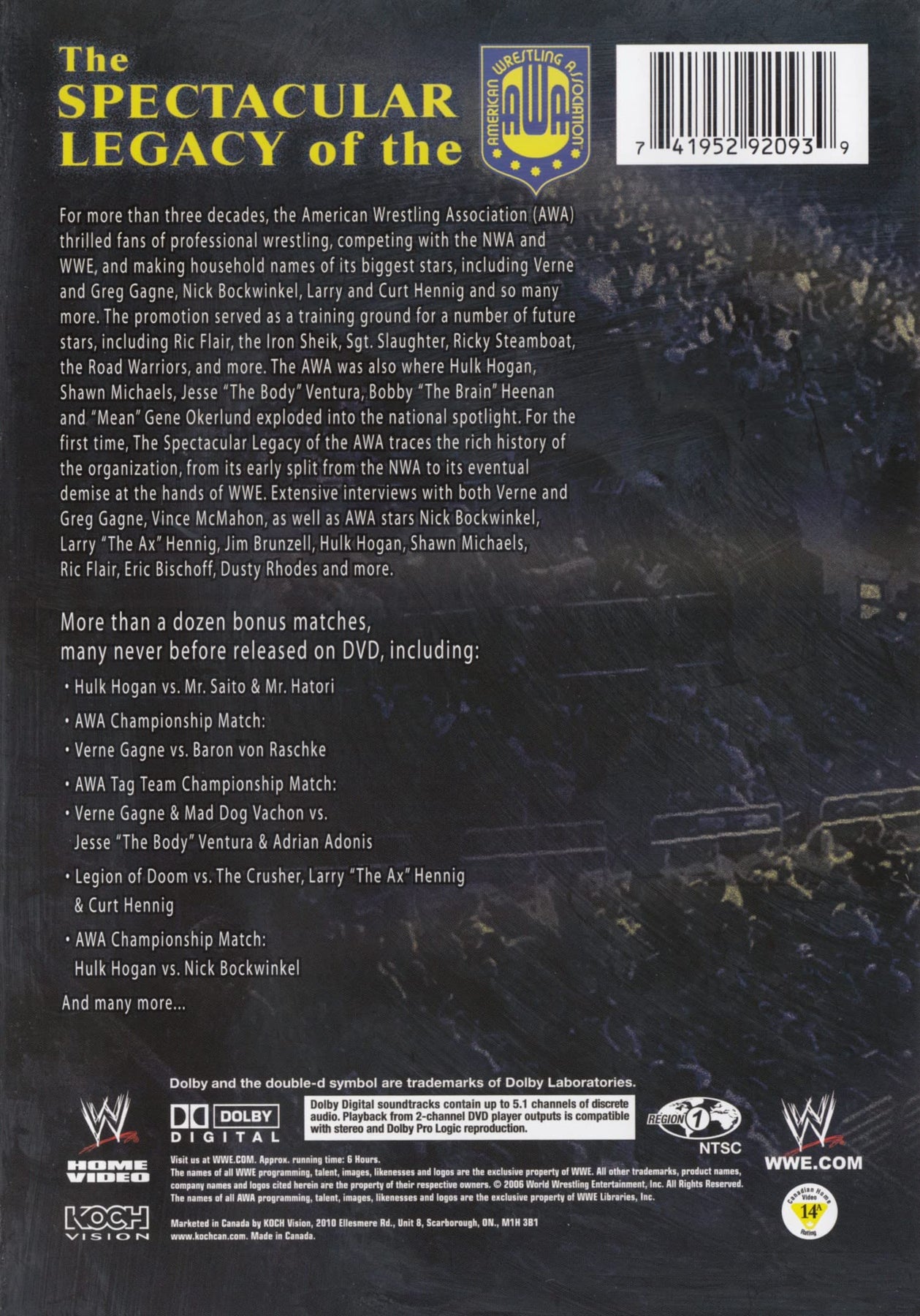 Details: WWE: The Spectacular Legacy of the AWA DESCRIPTION For more than three decades, the American Wrestling Association (AWA) thrilled fans of professional wrestling, competing with the NWA and WWE, and making household names of its biggest stars, including Verne and Greg Gagne, Nick Bockwinkel, Larry and Curt Hennig and so many more. The promotion served as a training ground for a number of future stars, including Ric Flair, the Iron Sheik, Sgt. Slaughter, Ricky Steamboat, the Road Warriors, and more. The AWA was also where Hulk Hogan, Shawn Michaels, Jesse "The Body" Ventura, Bobby "The Brain" Heenan and "Mean" Gene Okerlund exploded into the national spotlight. For the first time, The Spectacular Legacy of the AWA traces the rich history of the organization, from its early split from the NWA to its eventual demise at the hands of WWE. Extensive interviews with both Verne and Greg Gagne, Vince McMahon, as well as AWA stars Nick Bockwinkel, Larry " The Ax" Hennig, Jim Brunzell, Hulk Hogan, Shawn Michaels, Ric Flair, Eric Bischoff, Dusty Rhodes and more.