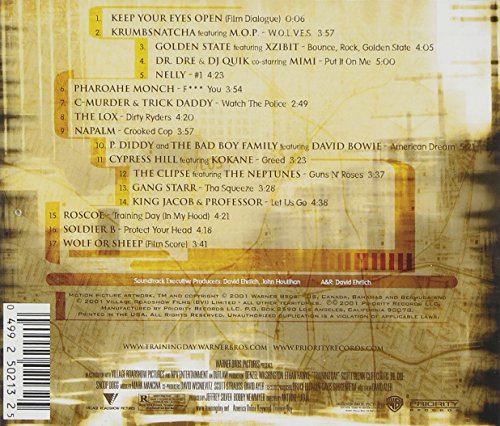 Details: Product description Training Day ~ Soundtrack Amazon.ca Give thanks to the folks behind Training Day for aiming a little higher on the musical food chain and actually putting together a collection that has more beef than filler. The meat is represented by an eclectic array of talent--everyone from underground champs Gang Starr to P. Diddy, whose hook-up with David Bowie's "American Dream" bites off more than it can spit out. On the plus side, there's "Put It on Me," an X-rated G-funk romp from Dr. Dre and DJ Quick; a fiery remake of N.W.A.'s "F*** tha Police" (now called "Watch the Police") by C-Murder and Trick Daddy; and "Wolves," a snarling, take-no-prisoners salvo from street dawgs M.O.P. Hip-hop's golden child Nelly checks in with "#1," a more-rugged-than-usual shout-out to the glory of success, while Pharoahe Monch's rock-stoked "F*** You" shines a light on this oft-overlooked wordsmith. In short, a veritable feast for ravenous rap fans that feels more like music than product. --Amy Linden